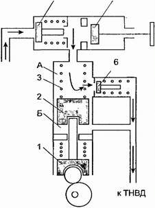 Рис. 2. Насос низкого давления: 1— толкатель; 2 — поршень; 3 — пружина; 4 — впускной клапан; 5 — насос; 6 — выпускной клапан