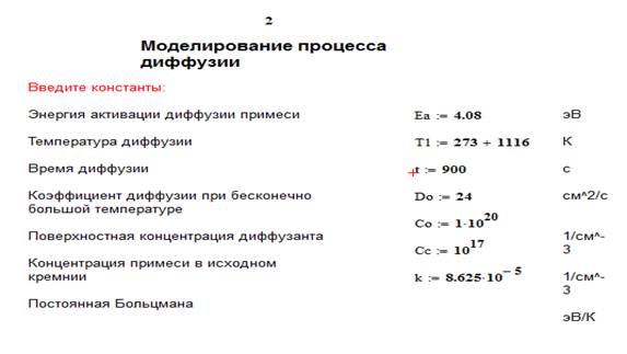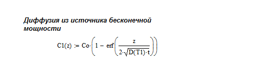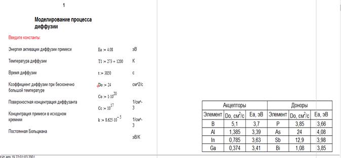 1. Провести исследования распределения концентрации примеси в полупроводнике от времени при фиксированной температуре (построить график). 2. Провести исследования распределения концентрации примеси в полупроводнике от температуры при фиксированном времени (построить график). 3. Составить маршрутную технологию формирования p-n перехода. Задание Варианты заданий приведены в табл. 1. 1. Рассчитать характеристики распределения заданной примеси в кремнии при одностадийной диффузии из источника бесконечной мощности (примесь 1). 2. Определить параметры двухстадийной диффузии той же примеси в кремнии для получения p-n перехода на заданной глубине и требуемой ее поверхностной концентрации (примеси 1 и 2). Таблица 1.