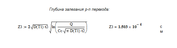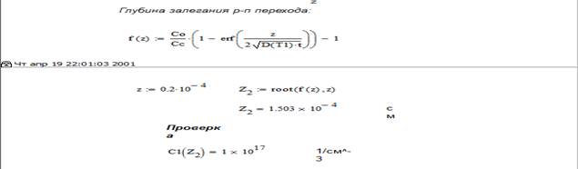 График распределения концентрации примеси в полупроводнике от температуры при фиксированном времени Вывод: рассчитали характеристики распределения заданной примеси в кремнии (глубина p-n перехода 1,5 мкм) при одностадийной диффузии из источника бесконечной мощности при условиях: температура Т = (273+1200) К, время t = 3850 с. Определили параметры двухстадийной диффузии той же примеси в кремнии для получения p-n перехода на заданной глубине и требуемой ее поверхностной концентрации (глубина p-n перехода 1,5 мкм, поверхностная концентрация примеси 1019 см-3) при условиях: температура Т = (273+1169) К, время t1 = 27000 с, t2 = 27,45 с. Провели исследования распределения концентрации примеси в полупроводнике от времени при фиксированной температуре (построили график). Провели исследования распределения концентрации примеси в полупроводнике от температуры при фиксированном времени (построили график). Составили маршрутную технологию формирования p-n перехода.
