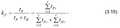 где N – число испытываемых образцов; rj – число отказов j-го образца; τij – время восстановления j-го образца после i-го отказа. 8. Коэффициент готовности (kг) – вероятность того, что система будет работоспособна в произвольно выбранный момент времени. Статистически определяется отношением суммарного времени пребывания системы в работоспособном состоянии к общему времени безотказной работы и вынужденных простоев системы, взятых за один и тот же календарный срок: где tР – время пребывания системы в работоспособном состоянии; tП – время вынужденного простоя; r – число перерывов в работе за выбранный календарный срок, включая отказы и остановки для проведения профилактики. В качестве вынужденного простоя рассматривается время, необходимое для обнаружения и устранения отказов и пуска системы в работу, а также время простоя из-за отсутствия запасных частей и время профилактических работ. При этом не учитывается время простоев на проведение плановых ремонтов и технического обслуживания. Если время вынужденного простоя в (3.13) принять равным времени восстановления системы τi, а затем числитель и знаменатель уравнения разделить на число отказов r, получим: