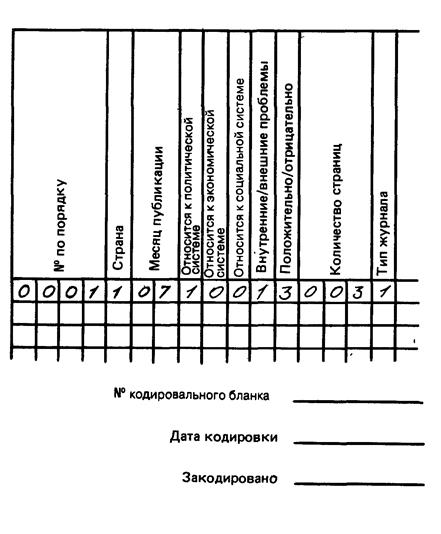 Первое, что нам следует рассмотреть, – это книга кодов. Книга кодов – это перечень всех переменных, встречающихся в исследовании, всех значений, которые могут принимать переменные, и всех приписанных им цифровых значений. Представьте, например, что 1 июля 1995 г. правительства Ирана, Никарагуа и Вьетнама заключили соглашения с некоторыми рекламными агентствами с целью улучшения своего имиджа в американской прессе и что мы хотим провести исследование, для того чтобы определить, каково воздействие этих усилий на содержание новостей и редакционных статей. В таком исследовании нам можно сравнить период, непосредственно предшествующий, и период, непосредственно следующий за исходной датой, с тем чтобы установить, что произошло после заключения контрактов: 1) количество репортажей о каждой) стране значительно возросло или значительно упало, 2) отношение к этим странам в прессе более предпочтительно или менее предпочтительно, чем в предыдущий период. Необходимо также учитывать такие дополнительные факторы, как регулярные сезонные перемены в репортажах, например большее внимание прессы к некоторым странам в период туристского сезона, или увеличение потока достойных внимания прессы событий во время обострения политической ситуации или в результате стихийных бедствий; однако для большей наглядности мы не будем обращать внимание на эти факторы. Для того чтобы оценить эффект усилий по улучшению имиджа, мы можем обратиться к любому количеству репортажей новостей или проанализировать лишь перечень, который может быть в форме как заголовков, так и кратких резюме различных статей и содержит, по сути дела, значительную долю информации; можно также использовать его лишь для обозначения самих статей. Для наглядности давайте воспользуемся перечнем (который в нашем случае содержит заголовки и полные библиографические ссылки) в “Reader's guide to Periodical Literature”, в котором публикуется содержание большого количества популярных журналов; выберем гуда заголовки “Иран”, “Никарагуа”, “Вьетнам”. Нашей зависимой переменной будет деятельность профессиональных рекламных агентств, точнее, ее отсутствие (до l июля 1995 г.) или присутствие (после этой даты). [c.365] Следуя двум отмеченным принципам, мы будем иметь два комплекса зависимых переменных. В первом будет учитываться количество статей, в нем будет отмечаться ежемесячное количество их в период до и после тестирования и соотношение (на основании заголовка или содержания) статей, относящихся к политической, экономической или социальной системам каждой страны. В дальнейшем мы будем обозначать эти статьи как затрагивающие внутренние или внешние проблемы. Второй комплекс зависимых переменных будет учитывать качество репортажей на основании суждений о том, насколько положительно или отрицательно (опять же на основании заголовков) оцениваются в них названные страны. И, наконец, в любом исследовании такого рода необходимо иметь специальные коды для обозначения каждой отдельной статьи, страны, к которой она относится, даты публикации, объема статьи, типа издания, в котором она появилась. В упрощенном виде макет кодировки для этого гипотетического исследования представлен в табл. 12.1. Как видите, макет кодировки суммирует переменные, используемые в исследовании, и приданные им значения. Это, по сути д