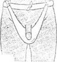 Последовательность действий: 1. Накладывают поясок-держалку, который завязывают вокруг талии. Прочной держалка получается из 2-3 горизонтальных туров бинта. 2. К пояску посередине привязывают начало бинта и, проводя его через промежность, выводят под поясок к противоположной стороне. 3. Сделав петлю вокруг пояска, бинт направляют прежним путем обратно. Вертикальные возвращающиеся туры бинта позволяют надежно закрепить перевязочный материал в промежности. Примечание. У мужчин при бинтовании заднего прохода вертикальные туры бинта спереда перекидывают через поясок не в одном месте, а в двух, оставляя половые органы в промежутке между расходящимися кпереди от заднего прохода верпжальными ходами бинта. Разновидность Т-образной повязки является суспензорий для мошонки. Из цпгрокого бинта делают пращу. Мошонку помещают в среднюю часть пращи, затем задние и передние завязки объединяют и, проходя по лобку, привязывают к пояску спереди.
