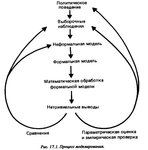 Математическое моделирование предполагает исследовательскую стратегию, несколько отличающуюся от стратегий тех основных форм политологического исследования, которые описаны нами в других главах, поскольку оно основывается одновременно как на индукции, так и на дедукции. Сейчас мы обсудим общий процесс построения модели, в суммарном виде изображенной на рис. 17.1.