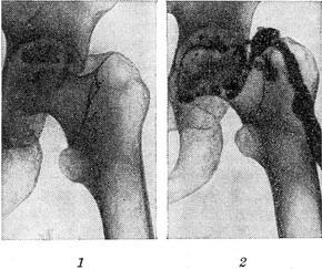Хронический гнойный коксит, осложнившийся некрозом части головки бедренной кости и образованием свища: 1 — контрольнаярентгенограмма (до фистулографии); 2 — фистулограмма.
