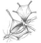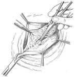 5. Вскрытие грыжевого мешка. Пользуясь пинцетом, ножницами, препаровочным тупфером и раствором новокаина в шприце на тонкой игле, хирург находит и выделяет грыжевой мешок из окружающих тканей, вскрывает мешок и, захватывая зажимами края его, рассекает вдоль. Для этого сестра должна иметь наготове 6-8 зажимов. Для отстранения элементов семенного канатика при прямой грыже хирургу потребуется марлевая тесьма или мягкая резинка, которую проводят под канатик и используют в качестве держалки (смотрите рисунок).