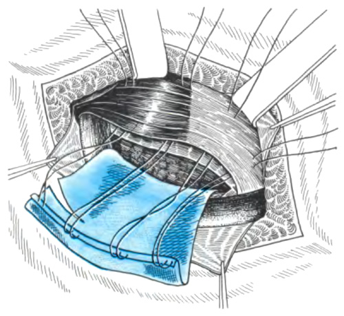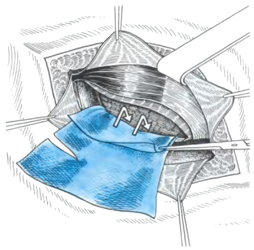 Способ Rives Затем каудальный край эксплантата располагают в отпрепарированном пространстве позади лобковой кости. Четырьмя П-образными узловыми швами подтягивают краниальный край пластины в сформированную предбрюшинную щель позади мышц. В итоге эксплантат, располагаясь между брюшиной и поперечной фасцией, надежно перекрывает все места, где возможно выхождение грыжи.
