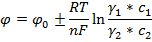 Уравнение (формула) Нернста дает зависимость величины равновесного потенциала от концентрации ионов в растворе электролита. Активность электролита связана с концентрацией уравнением