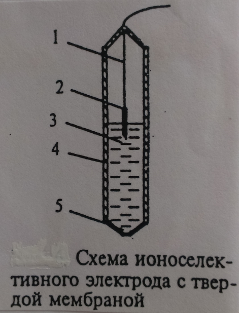 2) Ионоселективный электрод с твердой мембраной (риc.5) состоит из мембраны (5), корпуса (4), внутреннего раствора определяемого иона и хлорида калия (0,1 М КСl) (3) внутреннего полуэлемента Ag/AgCl (2), места припоя провода (1).