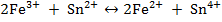 В процессе титрования потенциал сер. электрода будет возрастать, будет возрастать и ЭДС гальванического элемента (рис. 11) и в точке эквивалентности (1) обнаружится резкий скачек потенциала. Вслед за скачком идет почти горизонтальная кривая, соответствующая окончанию процесса комплексообразования. При дальнейшем добавлении Окислительно - восстановительное титрование. При протекании окислительно - восстановительной реакции, в растворе имеются ионы в окислительной и восстановительной формах. Если подобрать индикаторный электрод, обратимый относительно этих ионов, то по мере течения реакции концентрация ионов, находящихся в окислительной и восстановительной формах будет изменяться. В соответствии с формулой Нернста, будет меняться величина электродного потенциала и, следовательно, ЭДС гальванического элемента. Пример: Титрование хлорида железа (III) раствором хлорида олова (II).