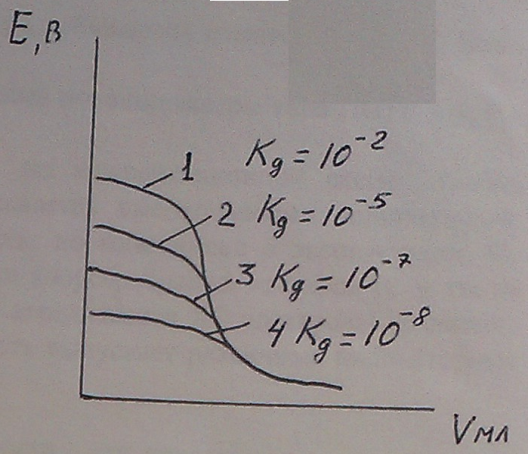 Снижение концентрации ионов Ag+ ведет к снижению ЭДС. Строят график зависимости изменения ЭДС от объема добавленного титранта.