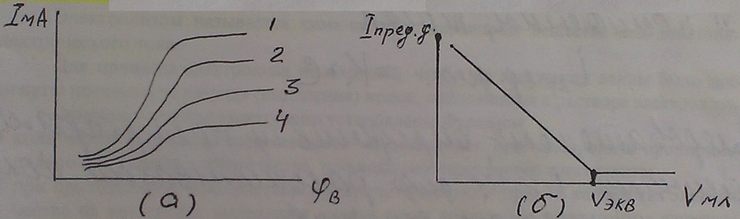 Рисунок 15 а - вольтамперные кривые при различной концентрации вещества а растворе, б - кривая амперометрического титрования. В процессе амперометрического титрования происходит увеличение объема раствора. Чтобы не вводить поправку на изменение объема, концентрация титранта должна быть в 10-20 раз выше концентрации исследуемого вещества. Аппаратура Установка для АТ компактна. В нее входят источник постоянного тока (1), потенциометр или магазин переменного сопротивления (2), вольтметр постоянного тока (3), микроамперметр постоянного тока (4), микробюретка (5), электролитическая ячейка с индикаторным электродом (6) и вспомогательным электродом (7), магнитная мешалка (8). Установив потенциометром (2) на вольтметре (3) значение потенциала предельного тока диффузии определяемого иона, в ячейку добавляют титрант и следят за показаниями микроамперметра. Строят график в координатах «I пред, диф - Умл» и определяют эквивалентный объем титранта, пошедшего на титрование, рассчитывают концентрацию исследуемого вещества по формуле: