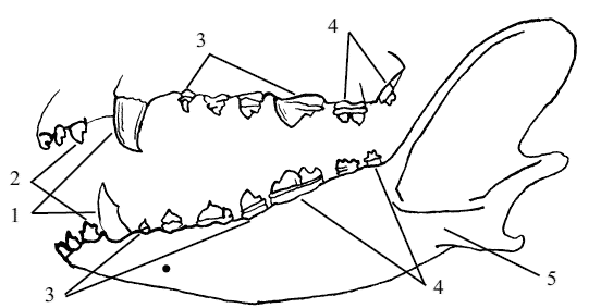 Рис. 3. Внешний вид зубов собак: 1 – клыки, 2 – резцы, 3 – премоляры, 4 – моляры, 5 – нижняя челюсть Присущее высокоорганизованным позвоночным животным дифиодонтное прорезывание зубов сопровождается процессом дифференциации и специализации отдельных видов зубов, т. е. возникновением гетеродонтного прикуса соответственно степени совершенства позвоночного животного. Дифиодонтная и гетеродонтная системы представляют, таким образом, явления, не только сопутствующие друг другу, но и сопряженные. Примитивные гомодонтные зубы рыб многократно меняются в течение жизни; более совершенные зубы рептилий прорезываются один раз; дифференцированные зубы собак и большинства млекопитающих прорезываются дважды в течение жизни – молочная смена и постоянная. Получил сильное развитие у млекопитающих корень зуба. Если в зоологическом ряду до высших позвоночных был один корень, то у млекопитающих появляются два и более корней. Кроме того, возникают ложные корни, которые являются непосредственным продолжением коронки в челюсти. Эти ложные корни не отделены от коронки шейкой зуба и обладают перманентным ростом, как, например, клыки у слона. Для всех млекопитающих характерно укрепление зуба по типу вколоченного соединения костей (гомфозис), или зубоальвеолярный состав. За счет разнообразия корма у млекопитающих стала изменяться и форма зубов с характерной для них функцией. У хищных животных сильно развиты клыки, а у травоядных – коренные зубы. Основная форма коренных зубов развивалась из простой конической формы (гаплоидной формы). В дальнейшем к конической форме прибавляются добавочные конусы, формируя трехзубчатую (трикодонтную) форму. В процессе филогенеза у млекопитающих зубной аппарат приобрел резкое изменение и превратился в жевательный аппарат. Это определялось за счет отложения большого количества минеральных солей и придало органическим частям зуба твердость и неподатливость. Постепенная потеря чувствительности эпителиального покрова привела к тому, что коронка легко выдерживает давление во время жевания и ограждает нижележащие ткани от определенных внешних воздействий. Характер расположения и взаимоотношений составных элементов зубов и особенности сочленения последних с челюстными костями придали зубам высших животных устойчивость, необходимую для выполнения механической функции режущего и размалывающего аппарата. На дне ротовой полости у позвоночных имеется непарный выступ – язык. В наиболее простом виде он впервые появляется у рыб. Язык у этих представителей животного мира представляет собой складку слизистой оболочки, которая поддерживается передним непарным элементом висцерального скелета. У рыб в языке отсутствует собственная мускулатура. Он движется лишь вместе со всем висцеральным аппаратом. У наземных позвоночных язык приобрел значение подвижного органа, служащего не только для удерживания корма в полости рта, но и для его перемещения в ротовой полости. Вначале это наблюдалось у амфибий за счет появления в языке собственной мускулатуры, являющейся продуктом обособления и дифференцировки подъязычной мускулатуры. В процессе развития мускулатуры языка совершенствовалась и иннервация этого органа. Она осуществляется главным образом за счет подъязычного нерва, отвечающего за подвижность, и язык