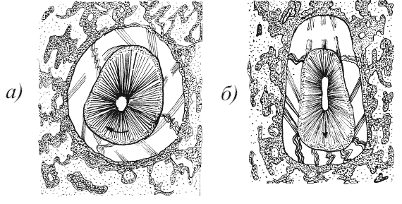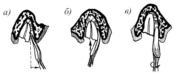 Рис. 66. Разрыв периодонтальных волокон: а) при ротации; б) при люксации Боковые вывихивающие движения надо начинать в сторону наименьшего сопротивления, т. е. в сторону наибольшей податливости альвеолярных стенок. Весьма важно, чтобы первое, расшатывающее зуб движение было очень слабым и чтобы амплитуда этих движений нарастала постепенно. При этом необходимо, чтобы щипцы все время были плотно сомкнуты вокруг удаляемого зуба. Когда корни зуба потеряют связь с альвеолой и движения зуба и щипцов станут свободными, приступают к последнему акту удаления зуба, или собственно экстракции, который заключается в извлечении его из альвеолы в том направлении (кнаружи и кнутри), куда он легче всего смещается при вывихивании. В вертикальном направлении, как это, например, имеет место при извлечении пробки из бутылки, извлечение зуба из альвеолы не производится. Для извлечения зуба обычно не требуется применения силы, как не требуется большого применения силы и при выполнении всей операции удаления зуба. Эффективность этой операции зависит не от физической силы ветеринарного врача, а от правильного и последовательного применения вышеуказанных приемов. В тех редких случаях, когда в результате оссифицирующего процесса у верхушки корня образуется костный конгломерат из альвеолярной стенки и цемента корня или когда вследствие хронического оссифицирующего периостита челюсти альвеолярная стенка уплотняется и становится малоподатливой, рекомендуется после неудачных попыток люксировать зуб приступить к оперативному удалению зуба (выдалбливанию). При технически сложном удалении зуба используют элеваторы. Особенно помогает применение элеваторов при удалении глубоко расположенных корней. У собак для верхних корней удобно применять прямой элеватор. Правой рукой берут за ручку элеватора, а левой рукой фиксируют верхнюю челюсть в области спинки носа таким образом, чтобы, помимо фиксации, создать опору для работы с инструментом. Щечку элеватора всталяют в пространство между удаляемым зубом и десной, после чего с помощью легких вывихивающих зуб движений элеватор продвигают постепенно все глубже. Когда связочный аппарат корня нарушен, элеватором производят более сильное, вывихивающее корень движение или заканчивают извлечение корня щипцами (рис. 67).