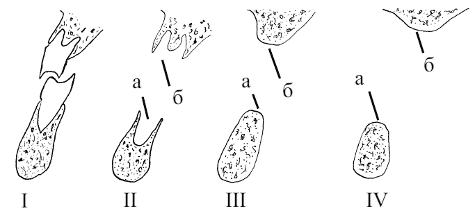 Рис. 71. Изменение соотношений альвеолярных отростков после потери зубов: I – соотношение правых моляров (во фронтальном разрезе); II – альвеолярные отростки после удаления моляров, линии а и б соответствуют середине альвеолярных отростков; III и IV – по мере развития атрофии линия а отклоняется кнаружи (вправо), отчего нижняя челюсть становится как бы шире Характер и степень атрофии альвеолярных отростков зависят от причины удаления зубов у собак. При пародонтопатии, например, атрофия более выражена. Есть основание считать, что после удаления зубов при этом заболевании убыль альвеолярного отростка является не только следствием утраты функции, но и самой пародонтопатии в связи с тем, что причины, вызвавшие ее, не прекратили своего действия. Здесь, следовательно, мы встречаемся со вторым видом атрофии альвеолярной кости, вызванной общей патологией. Кроме атрофии от бездеятельности, резорбции при общих и местных заболеваниях (пародонтопатии, периодонтита, сахарного диабета у собак), может иметь место возрастная (старческая, или сенильная) атрофия альвеолярного отростка (рис. 72).