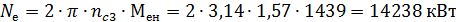 Для построения ограничительной характеристики на диаграмме Ne = f 3(v, nc) требуется определить два значения Ne для разных пс при Ме н= const, т.к. зависимость Ne при Ме н= const прямая линия АВ. Первую точку А берем для номинального режима Nе н= 26270 кВт и пс н = 1,73 с-1. Находим вторую точку В при пс 3=1,56 с-1, для чего вычисляем Nе при Ме н= const.