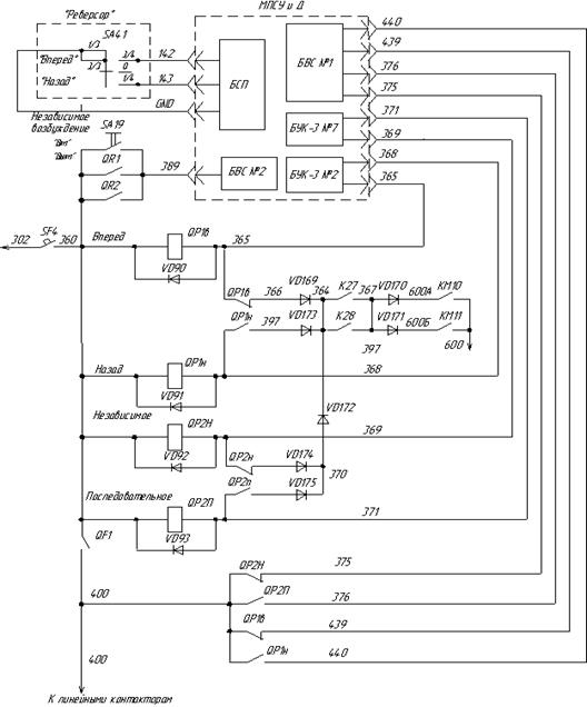 Для перехода в режим последовательного возбуждения при работающих регуляторах напряжения РН-3000 служит тумблер SA19 «Независимое возбуждение». При установке тумблера SA19 в положение «Выкл» система МПСУ и Д переводит режимный переключатель на последовательное возбуждение ТЭД. Система МПСУ и Д через БВС № 1 контролирует положение режимного переключателя по замыканию его вспомогательных контактов: · QP2Н - положение «Независимое» по проводу 375; · QP2П - положение «Последовательное» по проводу 376. Для исключения поворота режимного переключателя под током, после его установки в одно из положений и включения линейных контакторов, образуется дополнительная цепь питания соответствующего вентиля переключателя. Подпитка осуществляется через вспомогательные контакты линейных контакторов К27 или К28 по цепи: провод 302 (+110 В), автоматический выключатель SF4, провод 360, электромагнитный вентиль QР2Н (QР2П), провод 369 (371), вспомогательный контакт переключателя QР2Н (QР2П), диод VD174 (VD175) провод 370, диод VD172, провод 364, вспомогательный контакт контактора К27 (К28), провод 367, диод VD170 (VD171), провод 600А (600Б), вспомогательный контакт электромагнитного контактора КМ10 (КМ11), провод 600.