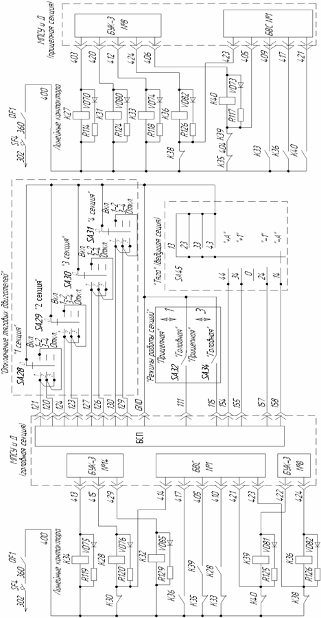 В случае повреждения тягового электродвигателя М1 или М2 в головнойи М3 или М4 в прицепнойсекциях, после установки переключателей SA28 «1 секция» в положение «1-2» и SA29 «2 секция» в положение «3-4», МПСУ и Д включает линейные контакторы согласно таблицы 4.2. При сборе схемы последовательного соединения при отключенных двигателях М1 и М2 в головной и М3 и М4 в прицепной секциях, МПСУ и Д замыкает цепь питания электромагнитных вентилей линейных контакторов К28, К32, К34, К36 и К39 на головной секции и К27, К31, К33, К36 и К40 – на прицепной секции (см. рисунок 25). На секциях второго электровоза сплотка в случае повреждения тягового электродвигателя М1 или М2 после установки переключателя SA30 «3 секция» (SA31 «4 секция») в положение «1-2» МПСУ и Д управляет линейными контакторами аналогично.