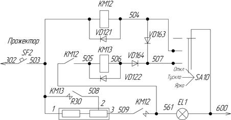 После установки переключателя SA10 в положение «Тускло» образуется цепь: провод 302 (+110 В), контакт выключателя автоматического SF2, провод 503, катушка электромагнитного контактора КМ12, провод 504, контакт переключателя SA10 (положение «Тускло»), провод 600. Контактор КМ12 включается, и лампа прожектора получает питание по цепи: провод 302 (+110 В), контакт выключателя автоматического SF2, провод 503, добавочный резистор R30, провод 509, силовой контакт контактора КМ12, провод 561, лампа прожектора EL1, провод 600. После установки переключателя SA10 в положение «Ярко» создается цепь для включения контактора КМ13. При этом цепь катушки контактора КМ12 от провода 504 замыкается через диод VD163, провод 507, контакт переключателя SA10 (положение «Ярко») на провод 600. Контактор КМ12 включается и катушка контактора КМ13 получает питание по цепи: провод 503, контакт блок-контакта контактора КМ12, провод 505, катушка контактора КМ13, провод 506, диодVD164, провод 507, контакт переключателя SA910 (положение «Ярко»), провод 600. Контактор КМ13 включается, замыкая своим силовым контактом цепь между проводами 503 и 508. При этом шунтируется значительная часть (выводы 1-2) добавочного сопротивления R30, что приводит к более яркому свечению лампы прожектора.