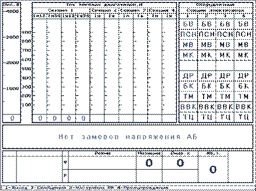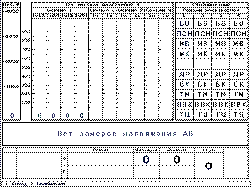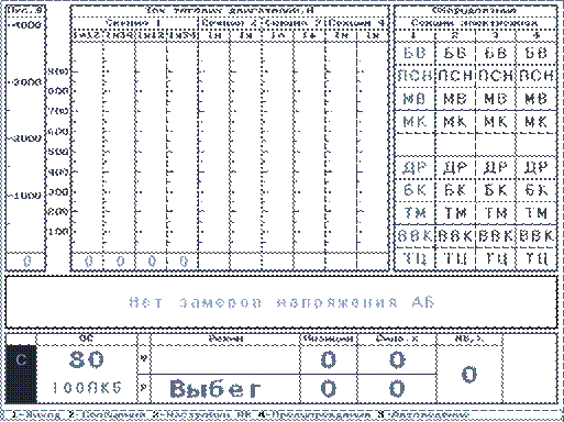 В правой части экрана расположены дискретные сигналы состояния устройств (БВ, ПСН, МВ, МК, ДР, БК, ТМ, ВВК, ТЦ) в секции электровоза (включено-выключено), а также его аварийное отключение. Число столбцов соответствует количеству секций электровоза. Принят следующий вид отображаемой информации: белая надпись на черном фоне означает отсутствие связи с аппаратами секции (при выключенном ВУ - для секций 2, 3, 4); зелёная надпись на черном фоне означает наличие связи с аппаратами данной секции (при выключенном ВУ - для секции 1); чёрная надпись на зелёном фоне – агрегат включен и нормально функционирует; чёрная надпись на красном фоне – агрегат был включен, но аварийно отключился (для БВ, ПСН, МВ, МК), либо означает аварийный режим работы электровоза (для ДР, БК, ТМ, ВВК). БВ (быстродействующий выключатель): на зеленом фоне, если включен переключатель БЫСТРОД. ВЫКЛЮЧАТЕЛЬ и в аппаратуру МСУЛ-А поступил сигнал «Включение БВ». Индикация включенного состояния БВ. на красном фоне, если при включенном переключателе БЫСТРОД. ВЫКЛЮЧАТЕЛЬ в течение трёх секунд нет либо пропал сигнал с блокировки БВ. Индикация отключенного состояния БВ. Для повторного включения БВ необходимо выключить-включить переключатель БЫСТРОД. ВЫКЛЮЧАТЕЛЬ. ПСН (преобразователь собственных нужд): на зеленом фоне, если при включенном переключателе БЫСТРОД. ВЫКЛЮЧАТЕЛЬ в аппаратуре МСУЛ-А появился сигнал «Контроль ПСН». Индикация включенного состояния ПСН. на красном фоне, если при включенном переключателе БЫСТРОД. ВЫКЛЮЧАТЕЛЬ в течение восьми секунд нет либо пропал сигнал «Контроль ПСН». Индикация отключенного состояния ПСН. Повторное включение ПСН производится только после выключения БВ. МВ (мотор- вентилятор охлаждения тяговых двигателей): на зеленом фоне, если при включенном переключателе ВЕНТИЛЯТОРЫ (а также при включенном БВ, отсутствии команды «Возврат защиты» и при наличии сигнала «Контроль ПСН») в аппаратуру МСУЛ-А поступает сигнал «Включение вентиляторов». Индикация включенного состояния МВ. На красном фоне, если при включенном переключателе ВЕНТИЛЯТОРЫ в течение пяти секунд нет, либо пропал сигнал «Включение вентиляторов». Индикация отключенного состояния МВ. Для повторного включения необходимо выключить-включить переключатель ВЕНТИЛЯТОРЫ. МК (мотор- компрессор): на зеленом фоне, если при включенном переключателе КОМПРЕССОРЫ, или нажатой кнопке ПРИНУДИТ. ВКЛ. КОМПРЕССОРОВ (а также при включенном БВ, отсутствии команды «Возврат защиты», наличии сигнала «Готовность МК» от блока управления мотор-компрессора и при наличии сигнала «Контроль ПСН") в аппаратуру МСУЛ-А поступает сигнал «Включение МК». Индикация включенного состояния МК. на красном фоне, если при включенном переключателе КОМПРЕССОРЫ, или нажатой кнопке ПРИНУДИТ. ВКЛ. КОМПРЕССОРОВ в течение пяти секунд нет, либо пропал сигнал «Включение компрессоров». Индикация отключенного состояния МК. Для повторного включения МК необходимо выключить-включить переключатель КОМПРЕССОРЫ. ДР (дифференциальное реле): на черном фоне с надписью «ДР», если после включения БВ в аппаратуру МСУЛ-А поступил на две секунды, а затем исчез сигнал «Возврат защиты». Индикация включенного состояния дифференциальных реле КА1 и КА2. на красном фоне с надписью «ДР» до и на две секунды после включения БВ, либо с надписью «ДР1», или «