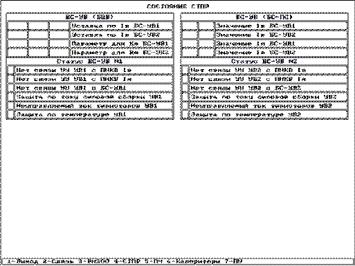 В столбце «Статус БС-ПС» выводится информация, характеризующая прохождение сигналов от МСУЛ по линиям связи БС-ПС и о готовности к работе и нарушении обмена по линии связи преобразователя собственных нужд. В столбце «Статус БС-УВ» выводится информация, характеризующая прохождение сигналов от управляемого выпрямителя по линиям связи БС-УВ. В столбце «РН3000» выводится информация, характеризующая прохождение сигналов от процессора регулятора по линиям связи РН-3000. Из меню окна «Связь ПСН» при нажатии соответствующих клавиш можно выйти в окна «Состояние РН3000 (РН3000)», «Состояние СТПР (СТПР)», «Состояние ПЧ ВО, ТК, ЗУ (ПЧ)», «Состояние калориферов (Калориферы)», «Состояние приточной установки (ПУ)». Возвратиться в основное меню (окно «Заставка») можно, нажав клавишу 1-«Выход». Режим «Состояние МСУЛ». Окно «Состояние РН3000». Выйти в это окно можно, нажав клавишу 3-«РН3000» в меню окна «Связь ПСН» режима «Состояние МСУЛ» (см. рисунок 15).