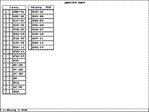 Вид «Состояние» в меню «Состояние МСУЛ" В столбце «БСП» выводится следующая информация, характеризующая прохождение сигналов по линии связи от каждого канала БСП: - после установки джойстика «Тяга» в положение «+1», или «+А» («-1», или «-А») индикацией соответствующей надписи; - после нажатия кнопки «Выбег» – «Выбег»; - после установки джойстика «Задатчик силы» в положение «+С», или «-С» индикацией соответствующей надписи; - после установки переключателя «Фиксация скорости» в положение «ФС» - «ФС»; - после установки переключателя «ПБЗ» в положение «Откл.» - «Откл. боксования»; - после нажатия кнопок «Песок» - «Песок»; - после установки переключателей «Яркость монитора» и «Отпуск тормозов» в положение «Вкл.» индикацией соответствующей надписи. В столбце «БУК» выводится следующая информация, характеризующая прохождение сигналов по линиям связи от каждого канала БЦВ: - на подпитку дифференциального реле при переходах с С на СП, с СП на П соединение ТЭД и наоборот - «Подпитка ДР-ТД»; - «КЭБ»; - «КЭП8»; - на разрешение применения противобоксовочной защиты ПБЗ (переключатель «ПБЗ» выключен) - «Разрешение (БЗС)»; - разрешение применения режима тяги«Режим «Тяга»; - на подачу песка под колесные пары для секции, ориентированной головой вперед - «Песок вперед», для секции сориентированной головой назад - «Песок назад»; - «Отпуск торм. лок.». В столбце «БВС-БЗС» выводится следующая информация прохождения сигналов от БВС или от БС-ДПС-БЗС по линиям связи: - разрешение применения тяги – «Разрешение тяги»; - разбор схемы режима тяги по команде от системы САУТ – «Откл. тяги от САУТ»; - слабое скольжение 1…4 колесной пары, соответственно - «Скольжение оси 1»; «Скольжение оси 2», «Скольжение оси 3», «Скольжение оси 4»; - сильное скольжение 1…4 колесной пары, соответственно - «Сильное cк. оси 1», «Сильное ск. оси 2», «Сильное ск. оси 3», «Сильное ск. оси 4». - подача песка при экстренном торможении, или срыве ЭПК при скорости движения более 10 км/ч – «Песок экстренно»; - нарушение целостности тормозной магистрали - «Обрыв ТМ». Наличие кратковременной информации «Обрыв ТМ» свидетельствует об исправности устройства контроля и сопутствует любому торможению крано машиниста. После нажатия клавиши 2-«Контакт» в меню окна «Управление тягой и торможением» в виде «Состояние» открывается окно «Управление тягой и торможением» в виде «Контакт». В этом окне для каждого сигнала в столбцах «БСП» и «БВС» можно получить информацию о прохождении сигнала в привязке к номеру блока и номеру контакта цепи, по которой проходит сигнал. Сигналы с надписями, характеризующими сигналы, аналогичны отображающимся на виде «Состояние». Из меню видов «Состояние» и «Контакт» окна «Управление тягой и торможением» после нажатия соответствующей клавиши можно перейти в окна «Вспомогательные машины и защита (ВМ)», «Режим силовой схемы (Режим)», «Реостатные контакторы силовой схемы (Позиции)», «Система измерений (СИ)», «Межсекционные связи (СМЕ)» и в режим «Связь ПСН (ПС)». Возвратиться в основное меню (окно «Заставка») можно, нажав клавишу 1-«Выход». Режим «Состояние МСУЛ». Окно «Реостатные контакторы силовой схемы». В данное окно в виде «Состояние» можно выйти, нажав клавишу 6-«Позиции» (см. рисунок 11)
