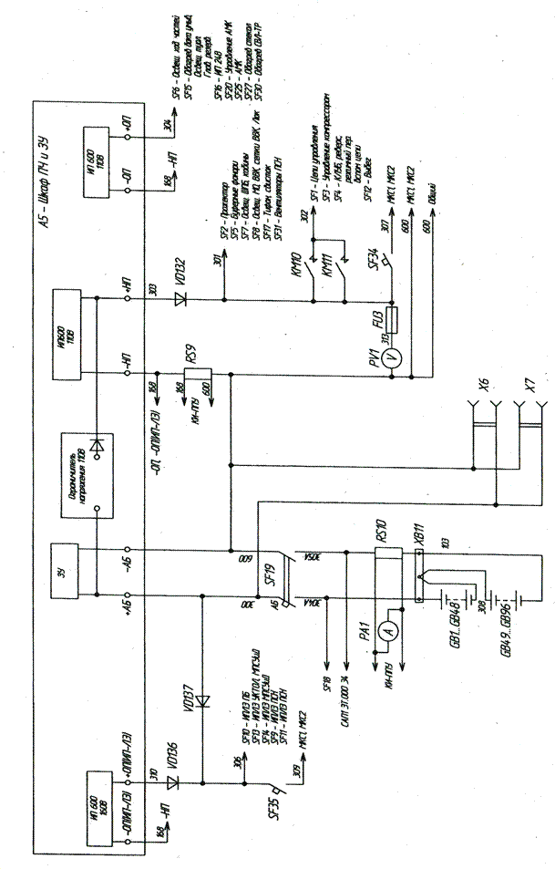 Выключатели - разъединители: QS30 – АКБ QS11 – вентилятор охлаждения ТЭД1, ТЭД2 QS12 – вентилятор охлаждения ТЭД3, ТЭД4 QS13 – МК1 QS14 – вентилятор ПТР QS15 – вентиляторы ПР QS16 – резерв QS17 – отопление. Автоматические выключатели: SF8 –резерв, SF7 - вентиляторы охлаждения ПР, SF4 - вентилятор охлаждения ТЭД4, SF3 - вентилятор охлаждения ТЭД3, SF2 - вентилятор охлаждения ТЭД2, SF1 - вентилятор охлаждения ТЭД1, SF6 - вентилятор ПТР, SF5 - МК1, SF50 – б/с – цепь 24В – 1, SF38 – подогрев масла МК1, SF37 – подогрев масла МК2, SF36 – МК2, SF35 – НОВ, SF34 – НОВ, SF33 – НОВ, SF32 – НОВ, SF28 – цепь АКБ – б/с – 1, SF29 – цепь АКБ – б/с – 2, SF30 – внешний ИП – цепь АКБ – 2, SF12 – внешний ИП – цепь диагностики, SF13 – внешний ИП – цепь АКБ – 1. Панель автоматов. 1. SF – резерв, 2. SF66 – освещение тамбура и проходов, 3. SF61 – освещение кабины, 4. SF67 – освещение дежурное, 5. SF62 – освещение левой ВВК, 6. SF63 – освещение правой ВВК, 7. SF64 – освещение подкузовное, 8. SF47 – управление пневмовентилями, 9. SF48 – управление подогревом масла компрессоров 10. SF46 – управление обогревом кабины, 11. SF24 – цепь питания КЛУБ, 12. SF40 – бытовые приборы, 13. SF42 – кондиционер, 14. SF11 – подогрев чистой и грязной воды, 15. SF10 – обогрев туалета.