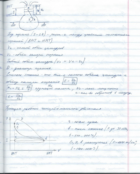 7)Принцип работы четырёхтактного двигателя При вращении коленчатого вала (рис.4, а) поршень движется от ВМТ к НМТ, объем в цилиндре увеличивается, давление уменьшается до 0,075-0,090 МПа. В это время с помощью газораспределительного механизма открывается впускной клапан (выпускной закрыт) и в цилиндр поступает чистый воздух. Осуществляется такт впуска. На индикаторной диаграмме (рис.4, д) линия ra. Коленчатый вал повернется на 180°. Воздух соприкасается с нагретыми стенками цилиндра и нагревается до 70-110°С.