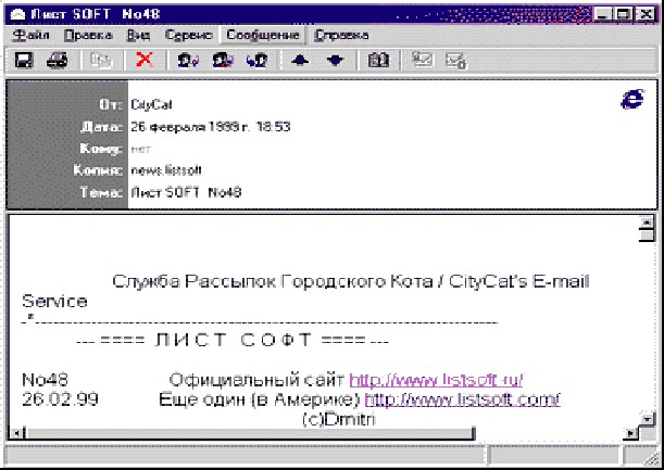 У вікні з листом, який прийшов, ви знайдете ряд нових елементів інтерфейсу, найбільш важливими з них є наступні кнопки: Відповісти відправнику (Reply to Author) відкриває вікно для формування відповідного листа. Текст вихідного листа може бути автоматично поміщений у це вікно. Знаки, що відзначають початок рядків цитованого тексту, визначаються там же, на закладці «Відправлення». Відповісти усім (Reply to All) - ця кнопка панелі інструментів діє зовсім аналогічно попередній кнопці «Відповісти відправнику». Виключення полягає в тому, що ваш відповідний лист розсилається не тільки первісному автору, але і всім іншим адресатам, яким був посланий аналогічний лист цим автором (які були включені в поле «Копія вихідного повідомлення»). Таким чином, ця функція має сенс лише в бізнес-переписуванні, коли ви організуєте в такий спосіб щось начебто дискусії Переслати (Forward) - ця кнопка дозволяє перенаправляти (переадресувати) отриманий лист іншому користувачу, якщо ви вважаєте, що йому (їй) він буде більш цікаво, чим вам. Дана функція дуже часто використовується в бізнесі-переписуванні. У розмовній мові серед користувачів пошти для цієї функції часто використовується сленговий термін "форварднути". Видалити (Delete) - натискання на цю кнопку видаляє повідомлення з поточної папки і поміщає його в папку «Вилучені». Згодом ви можете очистити папку «Вилучені вручну», або повідомлення будуть віддалятися з неї автоматично. Печатка (Prіnt) - кнопка із зображенням принтера посилає текст листа на принтер. Зверніть увагу, що при цьому друкується тільки текст листа, - якщо лист містить вкладені файли, то для їхньої печатки треба відкрити відповідну програму перегляду і виконати печатку вже з даної програми. Порада. Не слід лякатися усіх файлів, що прийшли з поштою, тому що далеко не усі файли можуть містити віруси. Наприклад, графічні файли (файли з розширеннями.gіf,.bmp,.tіf, і т.д.) і текстові файли (файли з розширеннями.txt,.rtf) у загальному випадку зовсім безпечні, у той час як документи Word (.doc) з великою ймовірністю можуть містити макровіруси. Ситуація, коли треба бути гранично обережними - це одержання файлів, які виконуються (із розширенням.exe,.com). Date: 2015-07-01; view: 321; Нарушение авторских прав |
