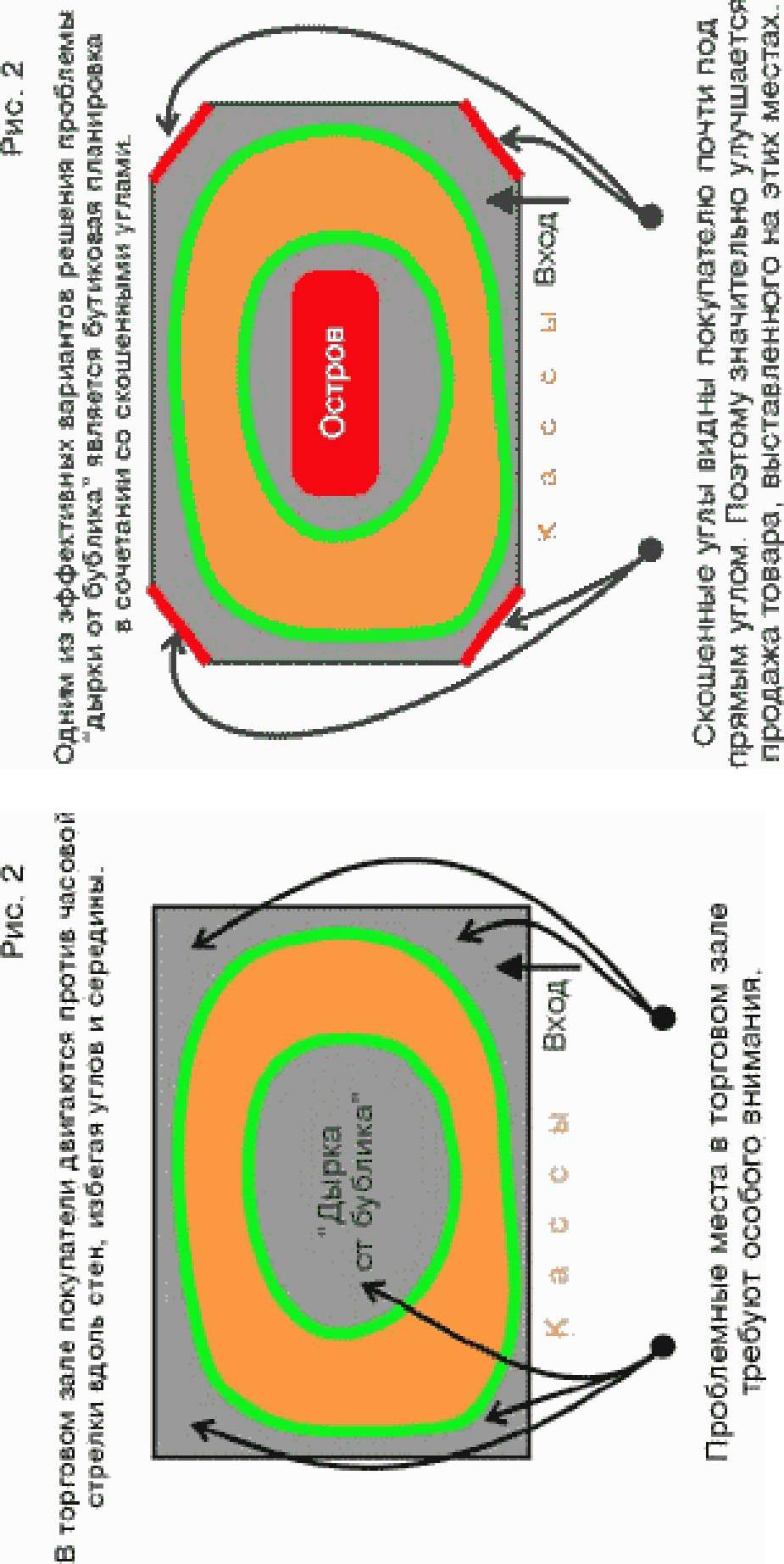 Рис. 1. Типы расположения торгового оборудования внутри торгового зала Часто покупатели обходят вниманием углы зала. Вот и получается, как у известного пролетарского поэта: "кому бублик, кому – дырка от бублика" (см. Рис.2). Как показывает опыт, проблема "бублика" очень актуальна, особенно для магазинов, имеющих большую площадь зала и магазинов-складов, где уходящее ввысь оборудование давит на клиента и делает углы особенно неприятными для посещения. Начнем с привлечения покупателей в дальние части магазина, углы, закутки и "аппендиксы". Они часто возникают при расположении магазинов на первых этажах реконструируемых зданий (особенно если раньше помещение использовалось в другом качестве). Прибыль и товарооборот с квадратного метра в таких местах иногда бывают просто катастрофически низкими, потому что покупатели туда просто не доходят. Нередки случаи, когда новые продавцы узнают о существовании какого-либо отдела только через два-три дня работы. В удаленных местах зала (и на верхних этажах) можно размещать товары предварительного выбора, специального спроса, ради которых покупатель готов преодолеть расстояние, и которые он будет спокойно, не опасаясь толчеи и любопытных взглядов, рассматривать и выбирать.