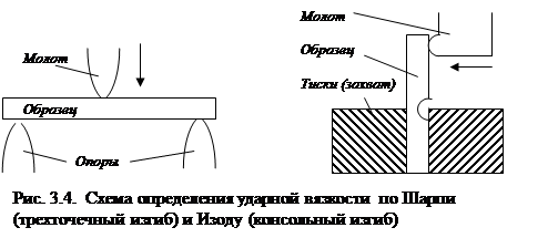 Прочность, определяемая максимальным напряжением, испытываемым материалом, имеет второстепенное значение. Поэтому стойкость на удар называют не ударной прочностью, а ударной вязкостью. Вязкость материала зависит от скорости, с которой наносится удар, от температуры, формы и размеров образца. Ударная вязкость резко снижается при высоких ударных скоростях, при температурах значительно ниже 0°С, а также при профиле детали, способствующем концентрации напряжений. Очень хрупкие материалы (стекло, бетон, чугун, силумины, закаленная инструментальная сталь) обычно не испытывают на ударную вязкость. Но если материал назначается для конструкции, эксплуатация которой предусматривает даже просто возможность ударных нагрузок, то он должен в паспорте иметь данные по устойчивости на удар (а или ан) - ударную пробу. Ударную вязкость определяют по разным методам, наиболее распространенными являются методы испытаний по Шарпи (трехточечный ударный изгиб) и по Изоду (ударный изгиб консольного образца) (рис. 3.4). По Шарпи испытывают образцы как с надрезом, так и без надреза, а по Изоду только с надрезом.