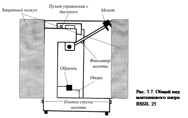 Вопрос о концентраторе напряжений с методической точки зрения не вполне согласован между разными стандартами и странами. Пропил надреза в странах СНГ производится разово фрезой со стандартным радиусом закругления концов зубьев, что предусматривает периодическую по мере изнашивания перезаточку, а это является сложной в техническом плане операцией. Наиболее простой выход разработан французами, которые сначала делают сверление на нужном расстоянии от поверхности сквозной дырки определенного радиуса, затем любой пилой прорезают надрез до дырки. Результаты испытания сильно зависят также от того, как образец вырезался: вдоль или поперек текстуры материала. Испытания проводятся на маятниковом копре CHEAST RESIL 25 (рис.3.7).Копер предназначен для определения ударной вязкости различных материалов, работа на разрушение которых не превышает 25 Дж (пластмассы, керамика, древесина, литьевые сплавы и т.д.). Погрешность определения работы разрушения менее 2% предела шкалы. Копер представляет собой прибор, регистрирующий автоматически угол поворота маятника. Прибор имеет встроенный процессор, который рассчитывает незамедлительно значение работы копра на разрушение образца и высвечивает его на дисплее. При испытаниях по Шарпи применяется молот с запасом энергии 11 Дж. Скорость удара 3,46 м/с согласно американского стандарта ASTM D256, что вполне соответствует международному ISO 179 (3,15…3,85 м/с), но несколько выше нормы скорости удара для российского (2,8 м/с) и меньше немецкого DIN 53488 (3,6…4,0 м/с) стандартов.