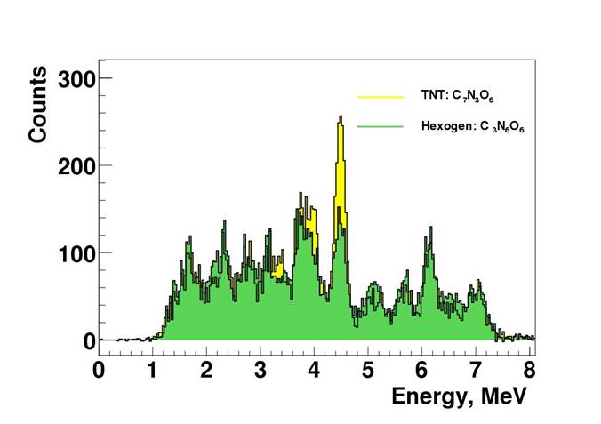 Пример спектра гамма-квантов для ТНТ (тротила) и гексогена показан на Рис.1.