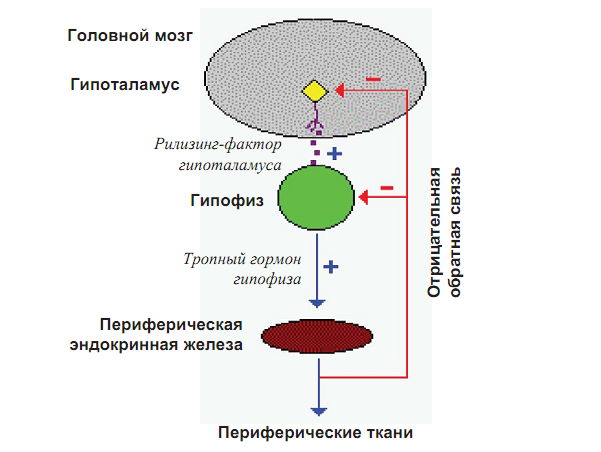 Гипофиздің тропты гормондары шеткері эндокринді бездер гормондарының бөлінуін ынталандырады. Бұл гормондар өз кезегінде шеткері тіндерде орналасқан рецепторларға ықпал етіп, биологиялық әсерін көрсетіп, тропты гормондар мен гипоталамустың рилизинг-гормондарының бөлінуін тежейді. Соңғысы, гипофиздің тропты гормондарының (кейде бірнеше гормондарды) өндірілуін ынталандыруды қамтамасыз етеді. Нәтижесінде, гипоталамус-гипофизарлы жүйе мен шеткері эндокринді бездердің арасында динамикалық тепе-теңдік қалыптасады.
