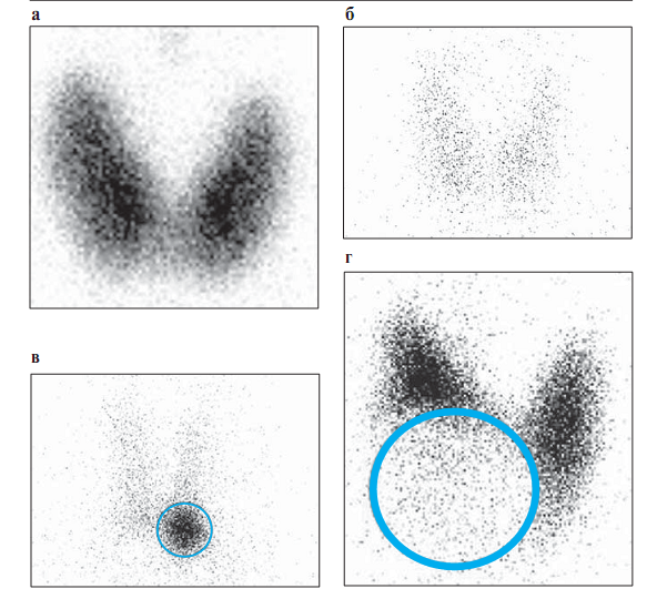 3.9 сурет. 99mТс-мен ҚБ сцинтиграфиясы. Белгіленген аймақтар УДЗ бойынша анықталған түйінді түзілістерге сәйкес келеді: а — Грейвс ауруындағы 99mТс сіңірілуінің жайылмалы түрде күшеюі; б — Деструктивті тиреотоксикоз (жеделдеу тиреоидит) кезіндегі 99mТс сіңірілуінің жайылмалы төмендеуі; в — ҚБ сол жақ бөлігіндегі «ыстық» түйінмен салыстырғанда ҚБ қалған тінінде 99mТс сіңірілуінің төмендеуі(түйінді уытты жемсау). г — ҚБ оң жақ бөлігіндегі «суық» түйін (түйінді эутиреоидты коллоидты пролиферлеуші жемсау).