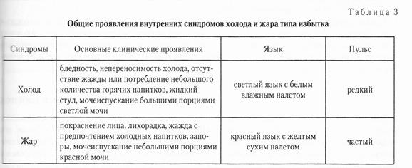 Синдром холода и синдром жара. Синдром холода — это патологическое состояние, возникающее в результате восприятия внешнего патогенного холода или при недостатке Ян в организме. Синдром жара — это патологическое состояние, возникающее в результате восприятия внешнего патогенного жара или при недостатке Инь в организме. В связи с тем, что синдромы холода и жара по своей природе полностью противоположны друг другу, их симптомы также имеют диаметрально противоположные различия. Синдром холода характеризуется непереносимостью холода, стремлением к теплу, снижением вкусовых ощущений во рту, отсутствием жажды, бледностью, похолоданием конечностей, склонностью спать, свернувшись в клубок, жидким стулом, мочеиспусканием большими порциями светлой мочи, светлым языком с белым влажным налетом, редким или напряженным пульсом. Синдром жара характеризуется повышением температуры тела, стремлением к прохладе, жаждой с предпочтением холодных напитков, покраснением лица и глаз, беспокойством и раздражительностью, сухим калом, мочеиспусканием небольшими порциями красной мочи, красным языком с желтым сухим налетом, частым пульсом. Дифференциация синдромов холода и жара не должна проводиться на основании какого-либо единичного проявления. Точный диагноз возможен лишь при комплексном исследовании всех клинических проявлений, самыми важными из которых являются ознобы и лихорадки, отсутствие или наличие жажды, цвет лица, ощущения жара или холода в конечностях, мочеиспускание и дефекация, состояние языка и тип пульса. В таблице 3 представлена дифференциация общих проявлений внутренних синдромов холода и жара типа избытка. Взаимосвязь между синдромами холода и жара. Хотя синдромы холода и жара по своей природе полностью противоположны друг другу, между ними существует определенная взаимосвязь. Они могут проявляться одновременно, образуя комбинированные синдромы холода и жара, а также при определенных условиях трансформироваться друг в друга. Кроме того, при тяжелых стадиях заболевания могут появиться синдромы истинного жара и ложного холода или истинного холода и ложного жара. Ниже приводится краткое описание основных проявлений взаимосвязи между синдромами холода и жара: 1. Комбинированные синдромы холода и жара. Наиболее распространенными синдромами этого типа являются: - жар в верхних и холод в нижних частях тела. Возникает при избытке Ян в верхних и избытке Инь в нижних частях тела. Характеризуется ощущением жжения в грудной клетке, час
