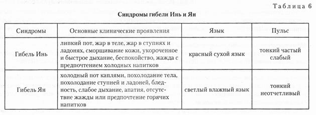 к синдромам типа Инь. Эти понятия также используются для объяснения патологических изменений в цзанфу-органах и тканях, таких как недостаток Инь и Ян, гибель Инь и Ян. К синдромам Инь относятся патологические состояния, возникающие в результате недостатка Ян-Ци или скопления патогенного холода, а к синдромам Ян — патологические состояния, образующиеся вследствие гиперактивности Ян-Ци или избытка патогенного жара. Таким образом, синдромы недостатка и холода относятся к синдромам Инь, а синдромы избытка и жара — к синдромам Ян. В целом, клинические проявления в виде возбуждения, беспокойства, суетливости, яркого цвета лица относятся к синдромам Ян, в то время как апатия, вялость, безучастность, тусклый цвет лица — к синдромам Инь. Под гибелью Инь подразумеваются патологические состояния, возникающие в результате сильной потери Инь-жидкости, а под гибелью Ян — патологические состояния сильного истощения Ян-Ци организма. Оба состояния являются критическими и могут быть следствием дальнейшего развития недостатка Инь и Ян, а также возникнуть при резком ухудшении течения некоторых острых заболеваний. Например, сильная рвота, понос или потеря крови могут вызвать гибель Инь, а сильный пот — гибель Ян. Инь и Ян взаимозависимы друг от друга, то есть ни одно из начал Инь и Ян не может существовать изолированно от другого. Следовательно, при гибели Инь рассеивается Ян-Ци, а при гибели Ян повреждаются Инь-жидкости. Тем не менее причинные факторы возникновения патологических изменений различны, что следует учитывать при выборе методов лечения. Кроме специфических проявлений синдромов гибели Инь и Ян, в обоих случаях наблюдается выделение пота. Симптомы указанных состояний приведены в таблице 6.