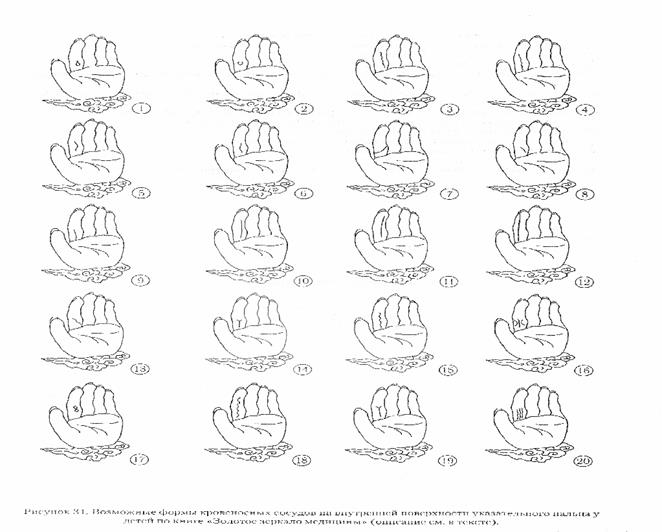 восприятия ветра-холода, фиолетовые или темно-красные — о синдроме жара, синие — о синдромах ветра и боли, светлые — о синдроме недостатка. Темные и крупные сосуды — признак избытка патогенной Ци и тяжелой стадии болезни, тонкие и светлые — свидетельство недостатка жизненной Ци. Поверхностные сосуды указывают на наружный синдром,а глубокие — на внутренний. В книге «И цзун цзинь цзянь» (Золотое зеркало медицины, 1749 г.) описаны возможные формы кровеносных сосудов на внутренней поверхности указательного пальца у детей и соответствующие им болезни: 1.В виде капли красного цвета — внутренний жар. 2.В виде кружка — повреждение пищей. 3.Уползающая змейка, утолщенный край к концу пальца, узкий край к основанию пальца — рвота и понос из-за повреждения пищей. 4.Подползающая змейка, утолщенный край к основанию пальца, узкий край к концу пальца — цинга из-за сырости-жара. 5.Лук, направленный внутрь к среднему пальцу, — простуда из-за восприятия патогенного холода. 6.Лук, направленный наружу к большому пальцу, — внутренний жар и скопление флегмы. 7.Сосуды, наклоненные к среднему пальцу, — повреждение ветром. 8.Сосуды, наклоненные к большому пальцу, — восприятие холода. 9.В виде короткой иглы — флегма-жар. 10.В виде длинного копья — флегма-жар. 11.В виде выстрела, пронизывающего сочленения, — сильное повреждение Ци селезенки, не лечится. 12.В виде выстрела, достигающего ногтя, — сильное повреждение Ци селезенки, не лечится. 13.В виде иероглифа «и» — судороги. 14.С двумя изгибами, словно крючок — повреждение сырой и холодной пищей. 15.С тремя изгибами, словно червяк — повреждение жесткой пищей. 16.В виде иероглифа «шуй» (вода) — кашель. 17.В виде двух соединенных окружностей — цинга. 18.В виде изогнутого червя — скопление пищи. 19.В виде рыбьей кости — жар со страхами. 20.В виде беспорядочно ползущих червей — глистная болезнь (рис. 31).