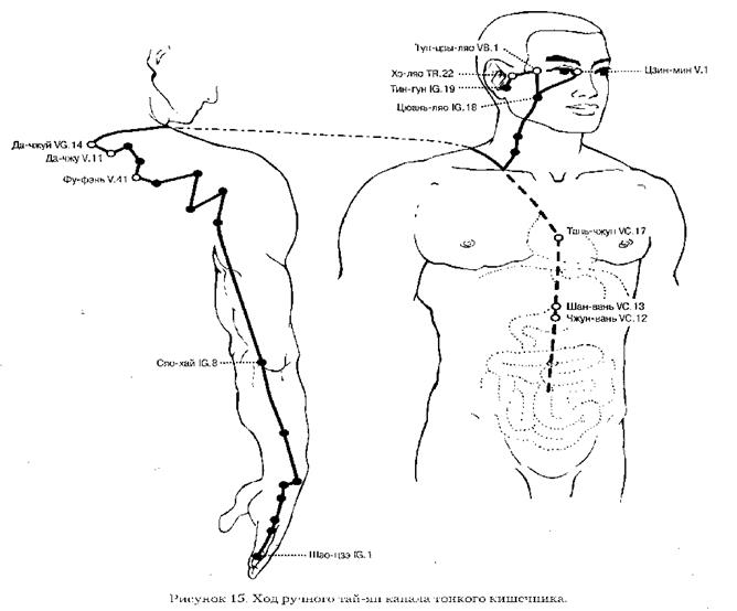 Ход канала: Ручной тай-ян канал тонкого кишечника начинается на локтевой стороне основания ногтя мизинца (Шао-цзэ IG.1), поднимается по локтевому краю кисти, выходит в области шиловидного отростка локтевой кости, поднимается по заднему краю наружной поверхности предплечья, выходит между локтевым отростком локтевой кости и медиальным надмыщелком плечевой кости (Сяо-хай IG.8), поднимается по заднему краю наружной поверхности плеча, достигает задней области плечевого сустава, зигзагообразно проходит по области лопатки, достигая точки Да-чжуй VG.14, где пересекается с сосудом Ду-май, проходит в надключичную ямку, проникает вглубь тела, связывается с сердцем, опускается вдоль пищевода, проходит диафрагму, достигает желудка, входит в относящийся к нему тонкий кишечник.