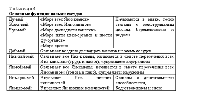 Кроме того, восемь сосудов во многих местах пересекаются с двенадцатью каналами, чем также способствуют усилению связей между каналами. Сосуды Чун-май и Жэнь-май тесно связаны с менструальным циклом, беременностью и родами. В каноне «Лин шу» говорится: «Сосуды Чун-май и Жэнь-май начинаются в матке». Поэтому два этих сосуда называют «сосудами матки». В каноне «Су вэнь» также говорится: «Когда [у девочки] менструации еще не начались, сосуды матки закрыты...». В каноне «Су вэнь» указано на связь функциональной активности сосудов Жэнь-май и Чун-май с 7-летними жизненными циклами у женщин: «В возрасте 14 лет у женщины возникает половое влечение, в сосуде Жэнь-май начинается движение, наполняется сосуд Чун-май, временами происходят менструации, поэтому и может забеременеть... В возрасте 49 лет в сосуде Жэнь-май возникает недостаток, ослабевает и истощается сосуд Чун-май, менструации прекращаются, тело стареет и женщина не беременеет...» С маткой связан и сосуд Ду-май. Ли Шичжэнь (1518—1593 гг.) писал: «Ду [-май] ~ это „море Ян-сосудов", этот сосуд начинается в матке ниже почек». Чжан Цзебинь (1563—1640 гг.) также писал: «Матка — это место хранения квинтэссенции Цзин у мужчин и женщин... Сосуды Чун-май, Жэнь-май и Ду-май начинаются в матке, поэтому и говорится „один источник — три разветвления" Функции восьми сосудов кратко представлены в таблице 4. Восемь сосудов вдоль и поперек пересекаются с двенадцатью каналами: - Ду-май проходит по задней срединной линии тела, пересекается с ножным тай-ян каналом мочевого пузыря и сосудом Жэнь-май; - Жэнь-май проходит по передней срединной линии тела, пересекается с ножным ян-мин каналом желудка и сосудом Ду-май; - Чун-май проходит по животу, пересекается с ножным шао-инь каналом почек; - Дай-май опоясывает туловище в талии, пересекается с ножным шао-ян каналом желчного пузыря; - Инь-вэй-май проходит по внутренней поверхности ноги, по животу идет к шее, пересекается с ножным шао-инь каналом почек, ножным тай-инь каналом селезенки, ножным цзюэ-инь каналом печени и сосудом Жэнь-май; - Ян-вэй-май проходит по наружной поверхности ноги, поднимается до надплечья, шеи и головы, пересекается с ножным тай-ян каналом мочевого пузыря, ручным тай-ян каналом тонкого кишечника, ручным шао-ян каналом Сань-цзяо, ножным шао-ян каналом желчного пузыря, ножным ян-мин каналом желудка и сосудом Ду-май; - Инь-цяо-май проходит по внутренней поверхности ноги, поднимается до глаза, пересекается с ножным шао-инь каналом почек и ножным тай-ян каналом мочевого пузыря; - Ян-цяо-май проходит по наружной поверхности ноги, надплечью и голове, пересекается с ножным тай-ян каналом мочевого пузыря, ножным ян-мин каналом желудка, ручным ян-мин каналом толстого кишечника и ножным шао-ян каналом желчного пузыря. В литературе на русском языке в обозначении сосудов Ду-май и Жэнь-май и их точек используется следующая аббревиатура, принятая во Франции: Сосуд Ду-май VG Vaisseau Gouverneur Сосуд Жэнь-май VC Vaisseau de la Conception