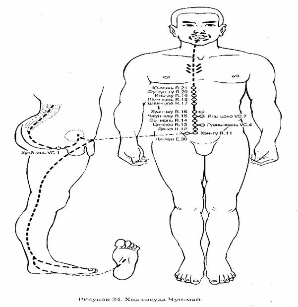 Вторая ветвь от грудной клетки поднимается по горлу до носоглотки, огибает рот. Третья ветвь начинается в матке, выходит в области точки Ци-чун Е.ЗО, идет по внутренней поверхности бедра, входит в подколенную ямку, идет по внутреннему краю большеберцовой кости, достигает места кзади от внутренней лодыжки, входит в подошву стопы. Четвертая ветвь от внутреннего края большеберцовой кости наискось входит во внутреннюю лодыжку, достигает тыла стопы, идет до большого пальца стопы. Пятая ветвь вместе с сосудом Жэнь-май начинается в матке, поднимается в позвоночнике. • Канон «Су вэнь»: «Чун-май начинается в Гуань-юань [VC.4], поднимается прямо вверх по животу...» • Канон «Лин шу»: «Чун-май — это „море пяти цзан-органов и шести фу-органов", все пять цзан-органов и шесть фу-органов получают [Ци и кровь сосуда Чун-май]. Его верхняя ветвь выходит в носоглотку, проникает во все Ян [-каналы], орошает всю квинтэссенцию Цзин. Его нижняя ветвь вливается в большую коллатераль шао-инь [почек], выходит в области паховой складки, идет по внутреннему краю Инь-стороны бедра, входит в подколенную ямку, опускается По внутреннему краю большеберцовой кости, достигает места сзади внутренней лодыжки и разделяется [на две ветви]. Его опускающаяся ветвь идет с шао-инъ каналом [почек], просачиваясь в три [ножные] Инь [каналы ]. Его идущая вперед ветвь идет по тылу стопы, входит в промежуток большого пальца». • Канон «Лин шу»: «Чун-май — это „море двенадцати каналов", вместе с большой коллатералью шао-инь [почек] начинается ниже почек, входит в области паховой складки, идет по внутреннему краю Инь-стороны бедра, входит в подколенную ямку, идет по внутреннему краю большеберцовой кости, идет с каналом шао-инь [почек], опускается и входит вместо сзади внутренней лодыжки, входит в подошву. Его ветвь наискось входит в лодыжку, выходит в тыл стопы, входит в промежуток большого пальца». • Канон «Лин шу»: «Сосуды Чун-май и Жэнь-май начинаются в матке, поднимаются в позвоночнике, являются „морями каналов и коллатералей". Их поверхностные ветви снаружи поднимаются по животу, соединяются в горле, ответвляются и окружают рот по губам». • Канон «Нань цзин» (Канон трудностей): «Чун-май начинается в Ци-чун [Е.ЗО], идет вместе с ножным ян-мин каналом [желудка], поднимается с двух сторон от пупка, достигает груди и рассеивается». • «Ци цзин ба май као» (Исследование восьми необычных каналов, 1578 г.): «Чун [-май] — это „море каналов". Еще его называют „морем крови". Этот сосуд вместе с Жэнь-май начинается в нижней части живота в матке. Его поверхностная наружная ветвь начинается в Ци-чун [Е.ЗО], соединяется с ножными каналами ян-мин [желудка] и шао-инь [почек], поднимается по животу до Хэн-гу [R. 11], поднимается с двух сторон от пупка на расстоянии 5 фэней [от передней срединной линии], проходит Да-хэ [R.12], Ци-сюэ [R.13], Сы-мань [R.14], Чжун-чжу [R.15], Хуан-шу [R.16], Шан-цюй [R.17], Ши-гуань [R.18], Инь-dy [R.19], [Фу-]тун-гу [R.20], Ю-мэнь [R.21], достигает груди и рассеивается».