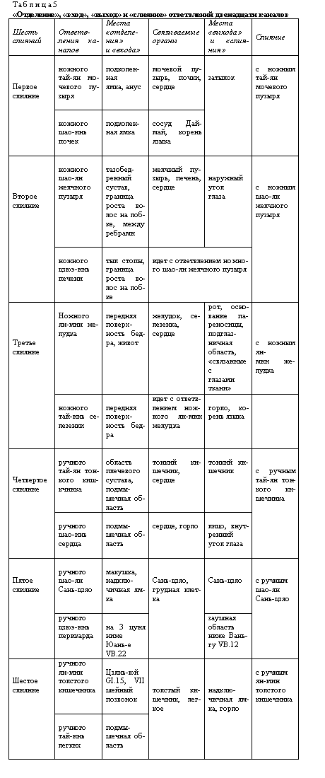 - «Отделение» (Ш ли), то есть отделение от основного канала с этим же названием в области четырех конечностей. - «Вход» (жу), то есть вход в грудную клетку и брюшную полость. - «Выход» (чу), то есть выход на поверхность тела и голову после связи со взаимосвязанными цзанфу-органами в грудной клетке и брюшной полости. - «Слияние» (хэ), то есть слияние ответвлений Ян-каналов со своими же каналами и слияние ответвлений Инь-каналов с Ян-каналами, связанными с их каналами наружно-внутренней взаимосвязью. Таким образом, ответвления двенадцати каналов, согласно наружно-внутренней взаимосвязи каналов, делятся на шесть групп, которые в каноне «Лин шу» обозначены термином «шесть слияний» (лю хэ) (таблица 5).