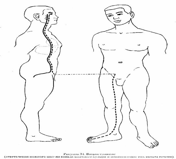 Второе слияние — это слияние ответвлений ножного шао-ян канала желчного пузыря и ножного цзюэ-инь канала печени с ножным шао-ян каналом желчного пузыря.
