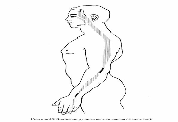 Ход мышц: Мышцы ручного шао-ян канала (Сань-цзяо) начинаются в безымянном пальце кисти (Гуань-чун TR.1), связываются на тыле запястья, поднимаются по предплечью, связываются в области локтевого отростка (Тянь-цзин TR.10), поднимаются по наружной поверхности плеча, проходят надплечье, идут по шее, соединяются с мышцами ручного тай-ян канала (тонкого кишечника). Ветвь входит в область угла нижней челюсти, связывается с корнем языка.