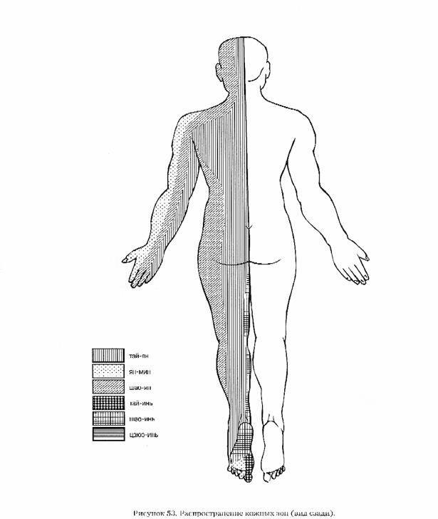 Внешние патогенные факторы через кожу проникают с поверхности тела вглубь организма. В каноне «Су вэнь» говорится: «Кожа — это зона сосудов. Когда патогенная Ци проникает в кожу, открываются поры кожи. Когда они открываются, патогенная Ци входит внутрь и проникает в коллатерали. Когда коллатерали переполняются, вливается в каналы. Когда каналы переполняются, проникает в цзанфу-органы». В то же время патогенная Ци изнутри организма распространяется на поверхность тела, вызывая изменения состояния кожи. Кожные зоны делятся на шесть групп по принадлежности ручных и ножных каналов к определенным степеням Инь и Ян: - кожная зона тай-инь; - кожная зона шао-инь; - кожная зона цзюэ-инь; - кожная зона тай-ян; - кожная зона ян-мин; - кожная зона шао-ян.