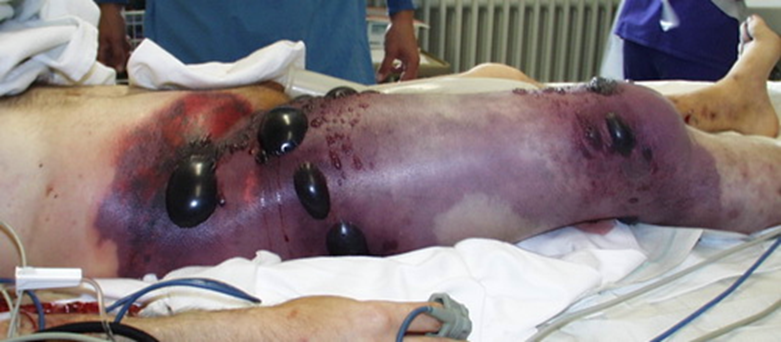 · Гангрена конечности. Стадии течения процесса: 1.Ограниченная газовая флегмона. 2.Расспространенная газовая флегмона. 3.Газовая гангрена. 4. Аэробный сепсис. Общие симптомы соответствуют выраженной интоксикации: состояние больного тяжелое, высокая лихорадка, слабость, разбитость, возбуждение, которое сменяется заторможенностью, бред. АД снижено. ЧСС 120-130, слабого наполнения. Местные симптомы: 1.Ограниченная газовая флегмона: Расспирающие боли в ране после периода успокоения. Быстро прогресирует отек, ощущение тесноты наложенной повязки. Ревизия раны: грязно-серый налет; отделяемое цвета мясных помоев в небольшом колличестве; отек краев раны; неприятный, приторно-сладковатый запах, признаков воспаления нет. Пальпаторно: отек и крепитация тканей, окружающих раневой канал. Рентгенограмма: пузырьки газа в тканях окружающих рану. 2.Расспространенная газовая флегмона: Расспирающие боли в ране усиливаются, распространяются в проксимальном направлении от раны, резкий отек «врезывание швов», если рана была зашита наглухо. Положительный симптом Мельникова (симптом лигатуры): шелковая нить, завязанная вокруг конечности вблизи раны, через 1,5-2 часа погружается в кожу вследствие отека; Кожа пораженной конечности бледная, с голубоватым рисунком просвечивающихся вен. Ревизия раны: края выбухают (выворачиваются), над поверхностью кожи; выделения не обильные, кровянисто-грязного цвета, неприятного специфического (типа ацетона) запаха. Пальпаторно: распространеннаякрепитация. Рентгенограмма: пузырьки газа в тканях, расположеных вдали от раны.