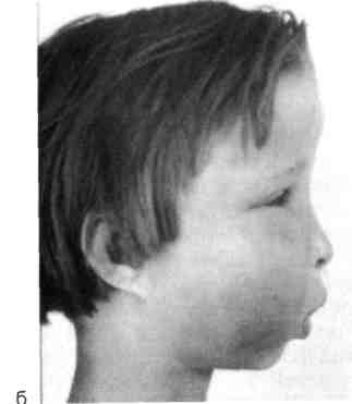Терапия при ОСП заключается в лечении основного заболевания — пульпита или периодонтита. Помимо местного лечения, детям, особенно младшего возраста, необходимо назначить противовоспалительную терапию: сульфаниламидные препараты в возрастной дозировке, глюконат кальция, гипосенсибилизирую-щие средства в таблетках, обильное питье, физиотерапию. Острый гнойный периостит (ОГП). При дальнейшем развитии серозного периостита серозное воспаление переходит в гнойное. Гнойный экссудат скапливается под периостом с образованием под-надкостничных абсцессов. ОГП характеризуется развитием в надкостнице двух разнонаправленных процессов. Происходят гибель надкостницы, расплавление и лакунарное рассасывание с образованием узур и проникновением экссудата под слизистую оболочку. Корковое костное вещество в месте соприкосновения с гнойным экссудатом частично подвергается разрушению. Одновременно под влиянием раздражения воспаленная надкостница «отвечает» активным построением молодой слоистой кости, отграничивающей патологический очаг от окружающих тканей. Чем активнее воспаление, тем больше выражены деструктивные процессы и, наоборот, чем спокойнее протекает заболевание, тем более значительны пролиферативные и пластические процессы. ОГП, по наблюдениям кафедры детской челюстно-лицевой хирургии и хирургической стоматологии МГМСУ, в 80 % случаев развивается в области молочных моляров и первого постоянного моляра верхней или нижней челюсти. Источником заболевания являются зубы с хроническими очагами воспаления в пульпе или периодонте. ОГП локализуется чаще с вестибулярной поверхности альвеолярного отростка в отличие от острого остеомиелита, при котором периостит выражен с обеих сторон альвеолярного отростка и тела челюсти. У детей младшего возраста ОГП развивается остро и быстро. Переход от стадии острого воспаления пульпы или периодонта может произойти за несколько часов. Заболевание характеризуется подъемом температуры тела до 38—38,5 °С. Общее состояние ребенка средней тяжести или тяжелое. Интоксикация особенно выражена у детей младшего возраста. Местно заболевание проявляется воспалительным отеком мягких тканей лица. При локализации процесса на верхней челюсти отек распространяется на подглазничную область, область носогубной борозды, верхнюю губу; глазная щель сужена или закрыта (рис. 6.15, а, б). При периостите нижней челюсти отек тканей щеки распространяется на поднижнечелюстную область. В месте непосредственного соприкосновения тканей лица с гнойным очагом наблюдается воспалительная инфильтрация мягких тканей с гиперемией кожного покрова, развиваются лимфаденит и периаденит поднижнечелюстных лимфатических узлов. Ребенок щадит больное место и ограничивает движения нижней челюсти. При осмотре выявляется гиперемированная и отечная слизистая оболочка. В области расположения поднадкостничного абсцесса выбухает переходная складка. При значительном скоплении гнойного экссудата и частичном разрушении надкостницы определяется флюктуация. Инфицированный зуб может иметь патологическую подвижность. В крови — увеличение СОЭ до 30—40 мм/ч, лейкоцитоз до 20,0—25,0109/л, в формуле в первые 1—2 дня наблюдаются незначительные сдвиги, свойственные воспалительным заболеваниям. Диагностика заболевания у детей пре