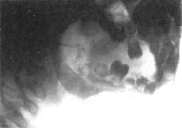 наблюдается у детей истощенных, ослабленных общим инфекционным заболеванием — гриппом, корью, скарлатиной, дифтерией, дизентерией и др. В младшем детском возрасте переход в хроническую стадию клинически начинает проявляться уже на 7—10-й день от начала заболевания. Деструктивная форма хронического одонтогенного остеомиелита имеет диффузный характер и распространяется на обширные участки нижней или верхней челюсти. Симптомы острого воспаления стихают, общее состояние ребенка несколько улучшается, температура тела снижается до субфебрильной, в очаге воспаления уменьшаются боли. Однако симптомы общей интоксикации организма остаются выраженными и сопутствуют всему периоду болезни. Отек и воспалительная инфильтрация мягких тканей постепенно уменьшаются, могут полностью исчезать. Лимфатические узлы остаются увеличенными и болезненными. На слизистой оболочке альвеолярного отростка и в области разрезов после вскрытия флегмон появляются свищи с гной- ным отделяемым и выбухающими грануляциями. При зондировании свиша определяются шероховатость обнаженной кости, при наличии секвестров — подвижные участки кости. Свищи иногда располагаются с обеих сторон альвеолярного отростка в области лунки удаленного зуба или снаружи. При обширной деструкции нижней челюсти возможен ее патологический перелом. Задержка оттока экссудата может вызвать обострение воспаления, клиническое проявление которого сходно с таковым острого одонтогенного остеомиелита. При поражении верхней челюсти свищи могут локализоваться в области альвеолярного отростка и на небе, в подглазничной области и др. На рентгенограммах костей лица, выполненных в динамике, определяются участки рассасывания губчатого и коркового веществ (рис. 6.18). Разрушение костных элементов протекает быстро, и процесс диффузно распространяется по кости. Окончательные границы поражения устанавливаются в более поздние сроки: к концу 2-го — началу 3-го месяца от начала заболевания. Деструктивная форма остеомиелита сопровождается формированием крупных секвестров. Формирование секвестров в области верхней челюсти определяется в более ранние сроки, чем на нижней, что связано с анатомическим строением челюстей у детей. На серийных рентгенограммах увеличивается склерозирование костного секвестра, в то время как в жизнеспособной кости, окружающей секвестр, появляется повышенная прозрачность с потерей трабекулярноого рисунка. Периостальное построение кости во всех стадиях деструктивной формы выражено слабо, ^ндостальное построение рентгенологически не определяется. Диагноз деструктивной формы хронического одонтогенного ос-