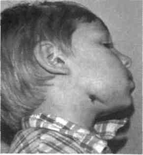 Рис. 6.21. Одонтогенный первично-хронический продуктивный остеомиелит нижней челюсти. лица. В течении заболевания наблюдается цикличность, что проявляется увеличением и уменьшением припухлости мягких тканей, увеличением объема челюсти. Объем кости увеличивается постепенно, кожные покровы над пораженным участком челюсти не изменены, свищи отсутствуют. Пальпируется плотное, без четких границ слегка болезненное выбухание. Регионарные лимфатические узлы увеличены, подвижны. Процесс чаще развивается на нижней челюсти. Заболевание может длиться годами и сопровождается частыми (до 6—8 раз в год) обострениями. В период обострения могут появляться болезненные при пальпации инфильтраты окружающих мягких тканей, тризм. Процесс имеет диффузный характер распространения и, как правило, занимает до половины нижней челюсти и более. В период обострения регионарные лимфатические узлы также увеличены, болезненны при пальпации, но периадениты, абсцессы и околочелюстные флегмоны развиваются редко (рис. 6.21). При этой форме остеомиелита могут быть слабовыраженные изменения общего состояния, но каждое обострение сопровождается температурной реакцией, изменениями крови (лейкоцитоз, увеличение СОЭ и др.) и мочи, характерными для воспалительных заболеваний. В развитии первично-хронической продуктивной формы одон-тогенного остеомиелита основную роль играют микробный пейзаж и реактивность организма, когда высокая инвазивность и вирулентность чаще атипичных штаммов взаимодействует с организмом, и, если уровень иммунной реакции снижен, условия для эффективного влияния высоко-инвазивных и вирулентных микробных ассоциаций становятся благоприятными, вызывают аутоиммунные реакции, снижающие защиту организма ребенка, способствуя началу заболевания. Рентгенологическая картина характеризуется увеличением объема кости за счет выраженных процессов эндостального и периостального костеобразования (рис. 6.22, а, б). Секвестры не определяются. В пораженном участке отмечается чередование очагов разрежения с нечеткими границами и зон остеосклероза. Кортикальный слой не просматривается и в зависимости от давности заболевания сливается с осси-фицированными периостальными наслоениями, имеющими чаще всего продольную слоистость. Вокруг зубов над очагом поражения имеются очаги хронического воспаления. Вокруг корней зубов с инфицированной пульпой определяются очаги разрежения с нечеткими контурами, деструкция межкорневых перегородок, расширение и деформация пе-риодонтальной щели; корни зубов могут быть резорбированы. Выявляется гибель зачатков (последних мо- D0B) у которых утрачена целость 4мыкательной пластинки и имеется зона разряжения вокруг зачатка; зона «роста» не контурируется. Располагаясь в очаге воспаления, зачаток прерывает развитие на ранней стадии. Инфицированные зубы и погибшие зачатки становятся вторичными очагами инфекции, поддерживая дальнейшее развитие патологических изменений в челюстных костях, способствуют обострению воспалительного процесса. Рентгенологически часто определяется недостаточное пломбирование корневых каналов, если в очаге поражения есть ранее леченные постоянные зубы. Такая рентгенологическая форма заболевания развивается в любом отделе нижней челюсти, значительно реже в верхней челюсти. В дет