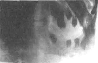 Рис. 6.18. Деструктивная форма хронического одонтогенного остеомиелита нижней челюсти. Рентгенограмма. теомиелита основывается на данных анамнеза, клинического, рентгенологического и лабораторного исследований больного в динамике. Деструктивно-продуктивная форма хронического одонтогенного остеомиелита чаще наблюдается у детей 7—12 лет. Причинами перехода острой формы в хроническую могут быть запоздалое удаление «причинного» зуба, неполный объем хирургического лечения, проведение консервативного лечения без учета патогенетической сущности заболевания, позднее определение чувствительности микрофлоры к антибиотикам, неполный объем комплексной терапии и др. Деструктивно-продуктивная форма хронического одонтогенного остеомиелита является наиболее частым исходом острого одонтогенного остеомиелита. Она начинается после 7—14-го дня от начала заболевания и характеризуется типичными клиническими признаками: субфебрильной температурой, стойкой интоксикацией с развитием вторичного иммунодефицита, формированием свищей (в местах разрезов, удаленных зубов и др.) с выбухающими грануляциями, исходящим гнойным экссудатом, мелкими