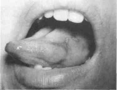 Рис. 7.1. Травматическая эрозия угла рта. ной способностью. Ответной реакцией слизистой оболочки на воздействие травмирующего фактора является воспаление, которое зависит от силы действия фактора, его продолжительности и защитных свойств организма. Слизистая оболочка полости рта имеет непосредственный контакт с внешней средой, поэтому при приеме пищи, чистке зубов, зубоврачебных вмешательствах она может подвергаться воздействиям, вызывающим ее поражение. При острой механической травме (случайное прикусывание, травма разрушенными зубами, зубной щеткой с жесткой щетиной и др.) возможны гиперемия поврежденного участка слизистой оболочки, деск-вамация эпителия, эрозирование или образование язвы, в зависимости от продолжительности травмы, ее интенсивности и ответной реакции организма. Данные анамнеза при отсутствии острого воспаления весьма скудны. Общее состояние и сон не нарушены, температура тела нормальная. В полости рта на фоне гиперемии слизистой оболочки — эрозии эпителия, чаще неправильной формы, покрытые фибринозным налетом. Прием пищи обычно малоболезненный. При присоединении вторичной инфекции увеличиваются отек и воспалительная реакция не только окружающих тканей полости рта, но и регионарных лимфатических узлов. Травматические повреждения встречаются у детей самого раннего возраста. Причиной их могут быть преждевременно прорезавшиеся молочные зубы. Твердые ткани таких зубов неполноценны, и при сосательных движениях их острые края травмируют не только сосок груди матери, но и уздечку и нижнюю поверхность языка, в результате чего образуются эрозии или язвы. При длительном раздражении на месте травмы возможны пролиферация и образование грануляционной ткани. Повреждения слизистой оболочки острыми краями собственных зубов могут наблюдаться в результате приступов кашля при коклюше или бронхите (болезнь Рига—Феде), при прикусывании слизистой оболочки после проведения анестезии. У детей раннего возраста нередко обнаруживаются прилипшие к слизистой оболочке твердого неба инородные тела (чешуйки семечек, сердцевинки яблок, обломки игрушек, монеты). При повышенной возбудимости нервной системы у детей часто выявляется хроническое прикусывание языка, губ, щек (рис. 7.1). Вследствие этой вредной привычки по линии смыкания зубов, на спинке языка, внутренней поверхности губ возникают очаги, покрытые белыми шероховатыми участками эпителия с поверхностными эрозиями, обрывками эпителия. Пациенты знают о своей вредной привычке, но отвыкают от нее с большим трудом. Причинами хронической травмы слизистой оболочки рта могут быть разрушенные кариозным процессом зубы, неправильно изготовленные ортодонтические аппараты. Таким образом, клинико-морфологические изменения, вызванные внешними раздражителями, бывают различны и неспецифичны для раздражителя. Одной из форм травматического повреждения слизистой оболочки рта являются так называемые афты новорожденных, впервые описанные Беднаром. Они возникают на слизистой оболочке посередине неба у ослабленных, недоношенных детей, имеют округлую форму, напоминая афты. Считают, что появление афт связано с повреждением слизистой оболочки неба при неосторожном протирании рта новорожденного, давлением грубого соска матери или длинной соски при искусственном вскар